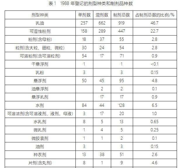 于此同時(shí),1978年改革開(kāi)放后,國(guó)外大量的農(nóng)藥新劑型、新制劑陸續(xù)在我國(guó)取得登記。直到1998年美、英、德等20個(gè)國(guó)家的74家公司在我國(guó)登記了500多種(其中衛(wèi)生制劑137種)農(nóng)藥,涉及的劑型有干懸浮劑9種、水分散粒劑4種、水乳劑2種、油懸浮劑1種、微膠囊劑1種。國(guó)外新劑型進(jìn)入我國(guó),帶動(dòng)和促使我國(guó)加快農(nóng)藥新劑型、新制劑的開(kāi)發(fā)。同時(shí)加速了我國(guó)農(nóng)藥加工工業(yè)的發(fā)展,逐步改變我國(guó)農(nóng)藥制劑品種少、質(zhì)量差、助劑不配套、加工設(shè)備落后的狀況,國(guó)家在“六五”“七五”期間將農(nóng)藥新劑型開(kāi)發(fā)列入國(guó)家攻關(guān)項(xiàng)目。化工部組織沈陽(yáng)化工研究院、安徽省化工研究院、北京農(nóng)業(yè)大學(xué)(現(xiàn)為中國(guó)農(nóng)業(yè)大學(xué))應(yīng)化系、山東農(nóng)業(yè)大學(xué)、浙江化工學(xué)校、中國(guó)農(nóng)科院植物保護(hù)研究所、上海農(nóng)藥所,以及浙江、四川、湖南、廣西、遼寧、江西、河北、福州等地的44個(gè)農(nóng)藥科學(xué)研究院(所)、大專(zhuān)院校、工廠協(xié)作攻關(guān),取得農(nóng)藥劑型加工科技成果150余項(xiàng),增加了農(nóng)藥新劑型新制劑品種,乳油產(chǎn)品質(zhì)量明顯提高,可濕性粉劑的配方、工藝設(shè)備和路線有很大突破,使懸浮率提高到60%~80%,一些粒劑和農(nóng)藥懸浮劑、微膠囊劑、水乳劑、微乳劑等新劑型、新制劑投放市場(chǎng)。國(guó)家攻關(guān)項(xiàng)目的完成,培養(yǎng)和造就了一支農(nóng)藥制劑開(kāi)發(fā)專(zhuān)業(yè)隊(duì)伍,這是我國(guó)農(nóng)藥劑型加工工業(yè)發(fā)展史上的關(guān)鍵一步,推動(dòng)了我國(guó)農(nóng)藥劑型工業(yè)快速發(fā)展。到20世紀(jì)80年代末期我國(guó)登記的農(nóng)藥原藥195種,農(nóng)藥劑型31種,農(nóng)藥制劑1970種(見(jiàn)表1),使我國(guó)原藥和制劑之比由“七五”期間的1∶3上升到1∶10。農(nóng)藥劑型結(jié)構(gòu)發(fā)生了很大變化,粉劑大幅下降到3%,乳油迅速上升至46.7%。