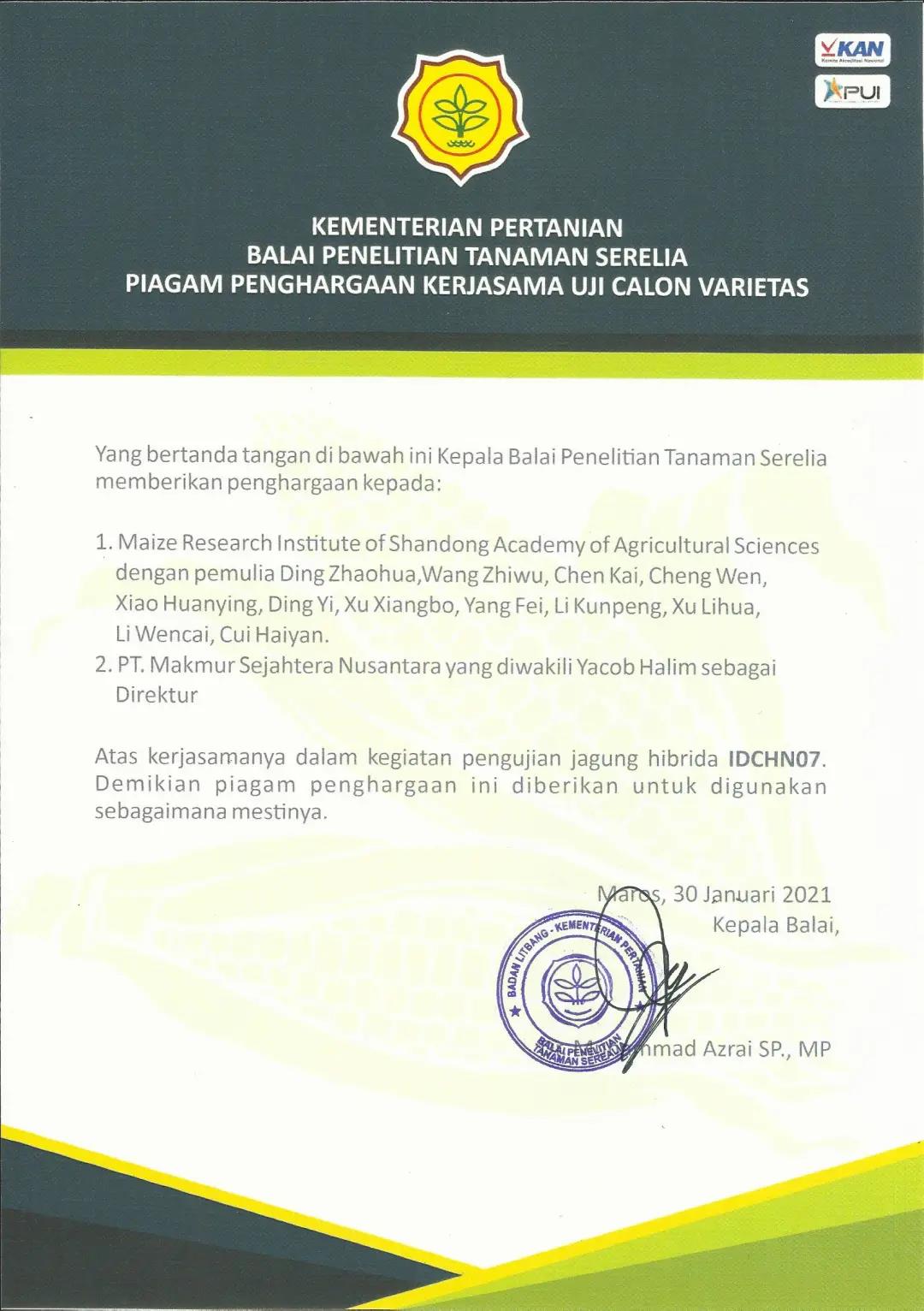 本次審定品種,由兩國專家在印尼歷時10余年選育而成,這為印尼玉米生產發展,以及農業科技創新均產生重要影響,切實實踐了“一帶一路”倡議。