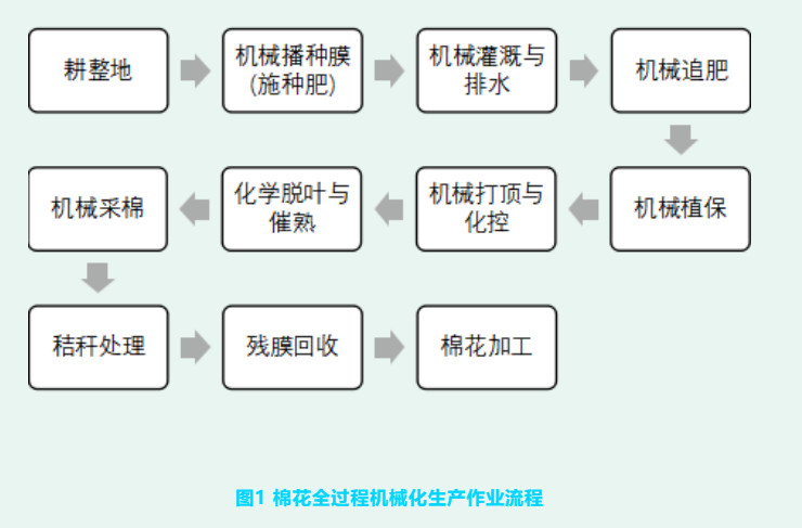 我國(guó)棉花種植歷史悠久,早在南北朝時(shí)期就有棉花種植的記載,如今,棉花已是我國(guó)的重要戰(zhàn)略物資、工業(yè)原料和百姓必需品,也是我國(guó)僅次于糧食的第二大農(nóng)作物和主要經(jīng)濟(jì)作物之一,2018-2019年我國(guó)棉花平均年產(chǎn)量占世界總產(chǎn)量的23%。國(guó)家統(tǒng)計(jì)局?jǐn)?shù)據(jù)顯示,2018-2019年我國(guó)棉花種植面積約5000萬(wàn)畝,主要種植區(qū)為新疆地區(qū)、江淮平原、華北平原、長(zhǎng)江下游濱海沿江平原等區(qū)域,經(jīng)過(guò)多年的發(fā)展,我國(guó)棉花種植生產(chǎn)逐步實(shí)現(xiàn)了機(jī)械化作業(yè)流程(圖1)。