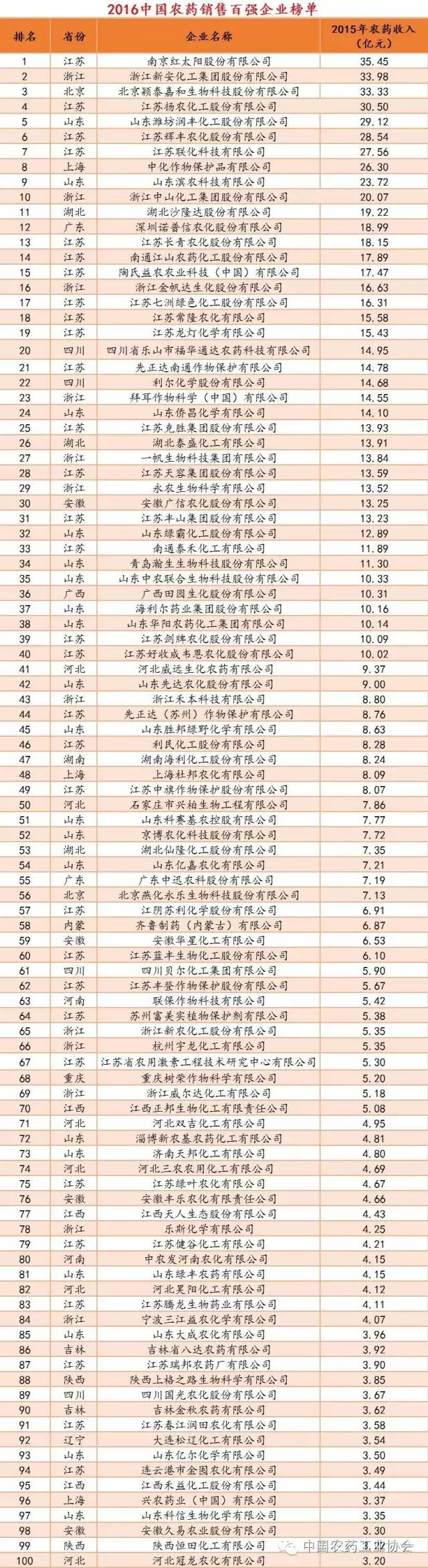 今日上午,2016中國農藥銷售百強企業榜單在第三屆農藥行業經濟運行分析會暨農藥行業排行榜發布會上隆重發布,南京紅太陽股份有限公司以35.45億元的銷售額高居榜首,浙江新安化工集團股份有限公司和北京穎泰嘉和生物科技股份有限公司分別以33.98億元和33.33億元的業績摘得榜眼和探花之位。
