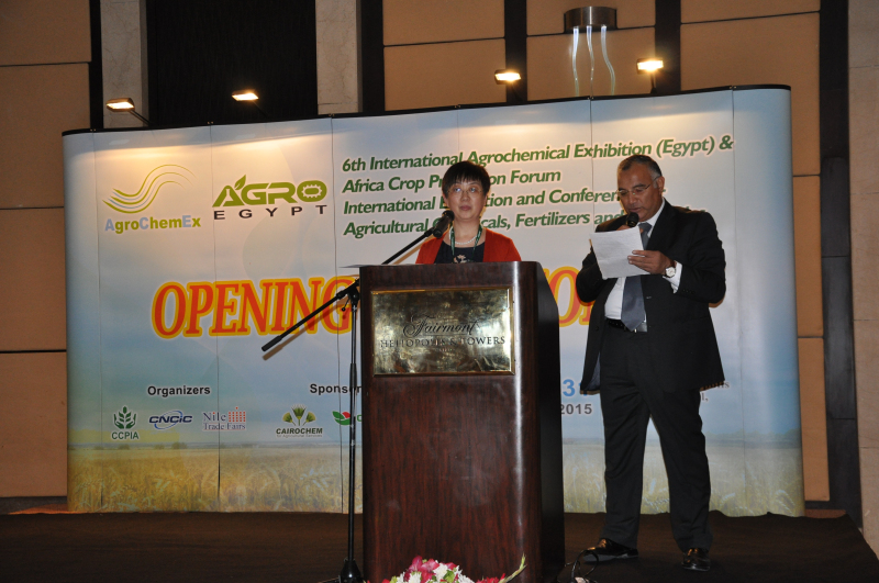 由中國農藥工業協會、中國化工信息中心聯合主辦的第六屆國際農化展覽會(埃及)暨非洲植保高峰論壇活動,在埃及農業部及中國駐埃及大使館的大力支持下,于2015年3月30日在埃及開羅正式拉開帷幕。出席本次開幕式的嘉賓包括中國駐埃及大使館公參韓兵先生,埃及農業與土地開墾部農藥委員會副主席Dr. Mustafa Abdel Sattar Hammad, 埃及化工品和化肥出口協會主席Mr. Waleed Helal,埃及工業和貿易部食品和農業技術中心Dr. Amgad A. El-Kady,聯合國糧農組織官方專家Mr. Mikhail Malkov 和中國農藥工業協會秘書長李鐘華。開幕式結束后,中國使館的韓公參與埃及農藥委員會Mustafa副主席等嘉賓在主辦單位的陪同下,參觀中國企業展臺,與展商親切交流并合影留念。