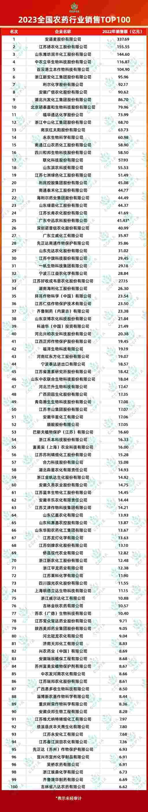 5月16日,安徽合肥,中國農藥工業協會發布了2023全國農藥行業銷售TOP100名單,安道麥股份有限公司以337.69億元的銷售額摘得桂冠,江蘇揚農化工股份有限公司銷售額達155.55億元,位列第二,山東濰坊潤豐化工股份有限公司銷售額達144.6億元,位列第三。