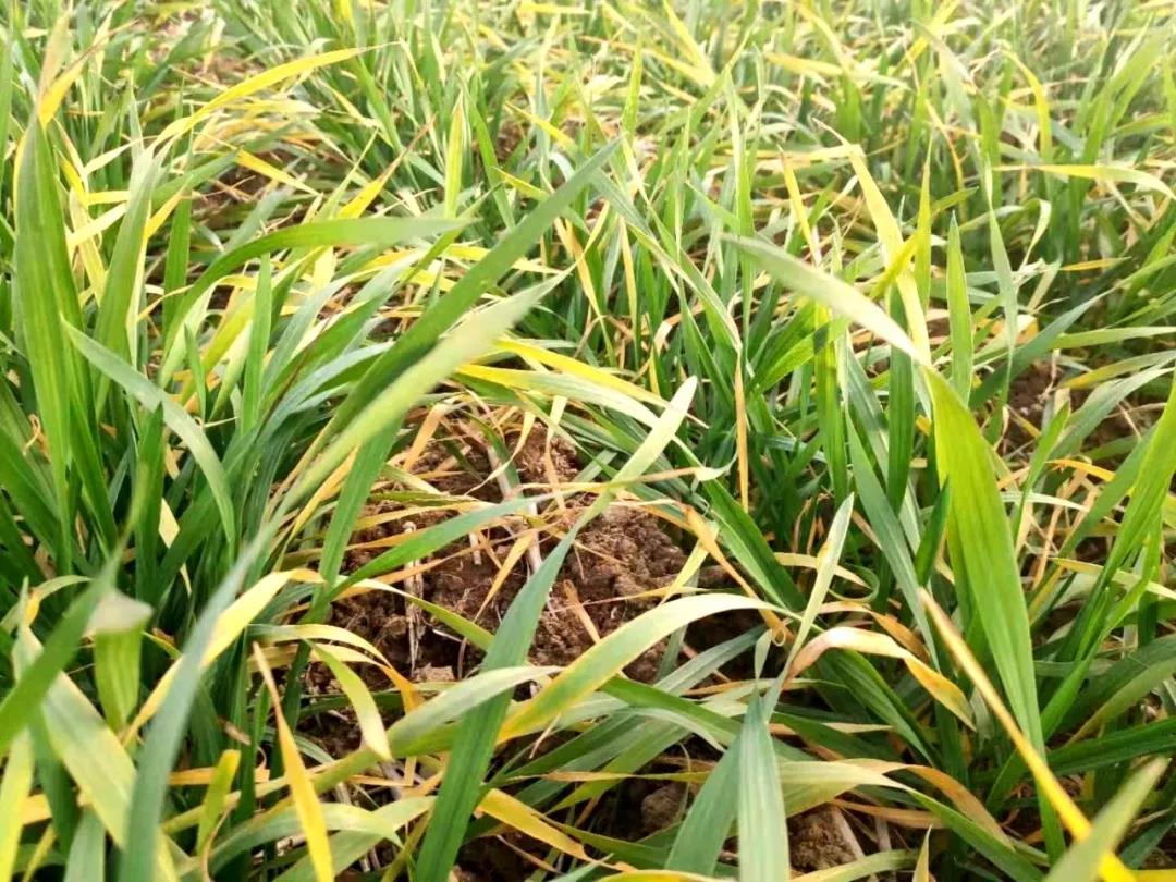 (三)前茬作物秸稈不規(guī)范還田造成“吊根苗”引起發(fā)黃。前茬作物秸稈粉碎不細、還田分散不勻,翻耕深度不夠,秸稈多的地方小麥根系被架空,根系與土壤不能充分結合,出現(xiàn)“吊根苗”,小麥黃根多,白根少,植株因得不到足夠的水份和養(yǎng)分,再加上強寒潮的侵襲,造成麥苗發(fā)黃。這種發(fā)黃,往往是心葉稍輕,老葉更黃;在田間是一行一片的,或一窩一塊的,分布不均勻。