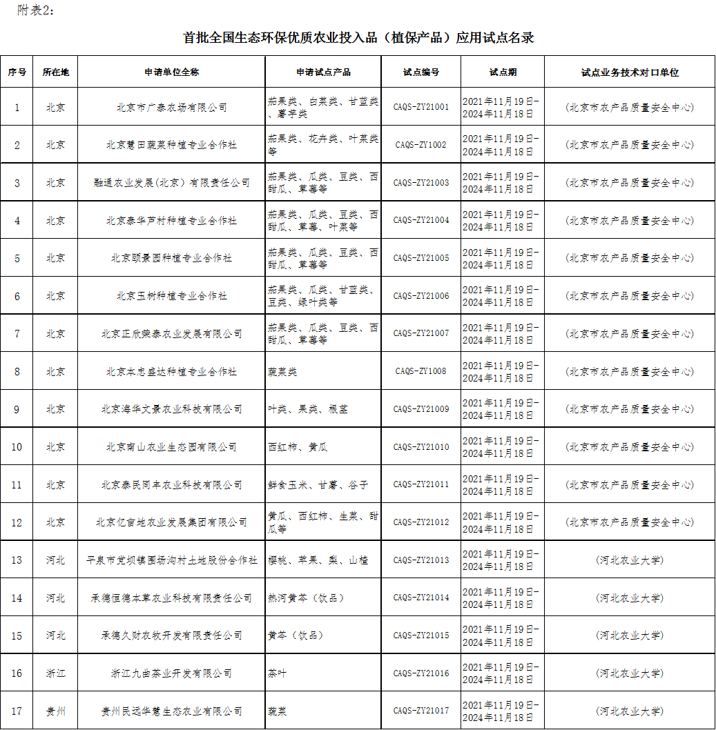 根據國家農安中心《關于提供生態環保優質農業投入品(植保用品)試點材料的函》(農質安(投)函〔2021〕129號)要求,由全國各農業投入品(植保產品)生產與應用單位自愿申請,經所在地(市、縣、區)及省級農產品質量安全與優質化工作機構審核推薦,國家農安中心組織專家技術評審和網上公示,確認將嘉禾源碩生態科技有限公司等37家植保產品生產單位納入首批全國生態環保優質農業投入品(植保產品)生產試點范圍,將北京市廣泰農場有限公司等17家植保產品應用單位納入首批全國生態環保優質農業投入品(植保產品)應用試點范圍(詳見附表),探索開展生態環保優質化試點,試點期3年。