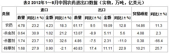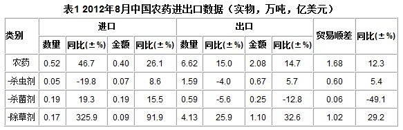 根據(jù)國家海關(guān)總署統(tǒng)計,2012年1~8月累計進(jìn)口農(nóng)藥4.78萬噸,同比增加23.2%,進(jìn)口金額4.23億美元,增長18.3%,平均進(jìn)口單價8849.4美元/噸,進(jìn)口單價同比下降4.13%。其中殺蟲劑平均進(jìn)口單價最高,為1.59萬美元/噸,較去年同期持平。進(jìn)口農(nóng)藥相當(dāng)于國產(chǎn)農(nóng)藥產(chǎn)量的2.1%(如表1)。