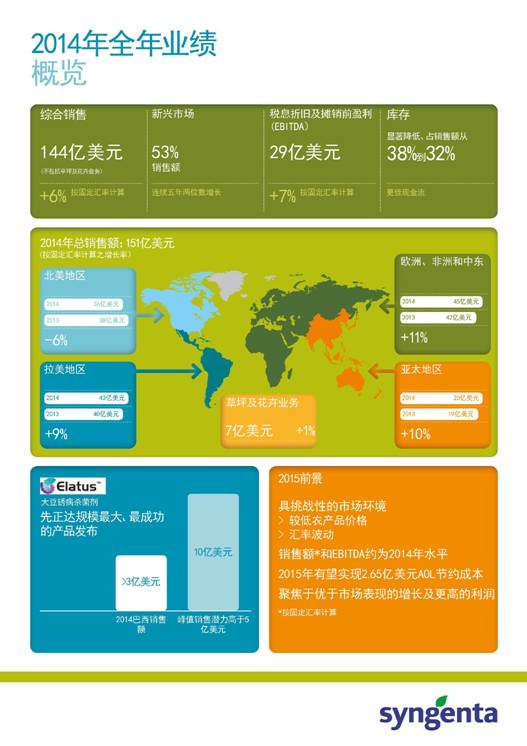 先正達CEO,Mike Mack稱:“2014年,盡管作物價格較上年下跌,北美地區氣候條件不利,草甘膦全球市場下滑,先正達仍然實現了綜合銷售同比增長6%的業績。盡管獨聯體方面政治動蕩,新興市場仍連續第五年實現雙位數增長。令人振奮的是,由于我們殺菌劑產品組合表現優異,西歐地區銷售增長明顯。在拉美地區,我們的新殺菌劑ELATUSTM在巴西上市后銷售額超過了3億美元,這是先正達歷史上產品上市首年銷售額最高紀錄,該產品在大豆銹病方面的作用效果得到了種植者們廣泛的高度認可。”