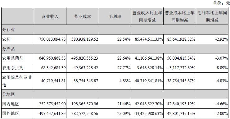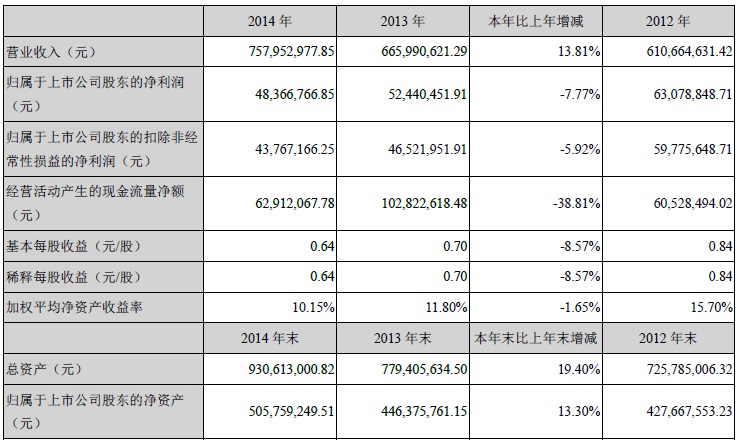 報告稱,2014年公司營業收入7.58億元,比上年同期增長13.81%,主要原因是硝磺草酮、噻蟲啉、苯醚甲環唑、百菌清等產品市場進一步拓展、銷量上升。利民股份2014年主要會計數據和財務指標如下表: