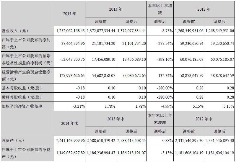 江蘇藍(lán)豐生物化工股份有限公司今日披露2014年年度報(bào)告,報(bào)告期內(nèi),公司營(yíng)業(yè)收入12.52億元,比上年同期下降8.75%。主要會(huì)計(jì)數(shù)據(jù)和財(cái)務(wù)指標(biāo)如下表: