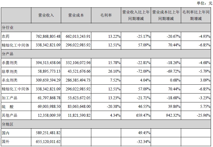 報(bào)告顯示,2014年,藍(lán)豐生化農(nóng)藥收入7.63億元,同比下降25.17%。具體分行業(yè)和分產(chǎn)品情況如下:
