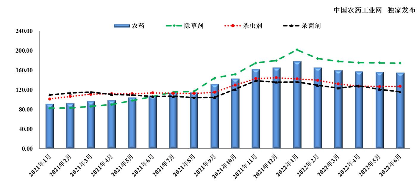 除草劑在草甘膦、草銨膦、2,4-滴等產品市場需求增加、價格上漲的帶動下,于1月創(chuàng)歷史新高,首次突破200點,較去年同期增長143.65%;隨后,隨著政策限制因素、供不應求局面一定程度上得以緩和,以及生產成本和物流壓力的減弱,除草劑價格指數理性回落,并基本維持在174-179點范圍內運行,但仍顯著高于去年同期水平。相較于除草劑價格指數較為顯著的回落態(tài)勢,殺蟲劑和殺菌劑價格指數在市場趨于理性的帶動下,呈緩慢下跌態(tài)勢,并逐漸接近于去年同期水平;其中,殺蟲劑價格指數由1月份的142.57逐漸下跌,二季度基本維持在126-128點水平,殺菌劑價格指數由1月份的136.57逐漸下跌至6月份的116.21。