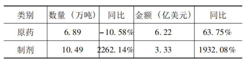 從原藥、制劑看,原藥量降額升,制劑同比大幅雙增。原藥出口數量為6.89萬噸,同比下降10.58%,出口金額為6.22億美元,同比增長63.75%;制劑出口數量為10.49萬噸,同比增長2262.14%,出口金額為3.33億美元,同比增長1932.08%。