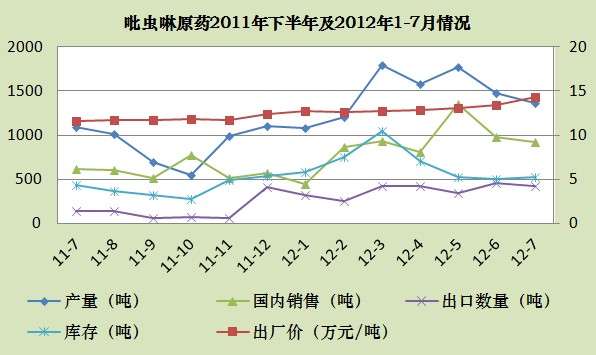 吡蟲啉原藥2012年總體情況較2011年回暖,產(chǎn)、銷等各項(xiàng)數(shù)據(jù)均比去年同期看好。特別是價(jià)格從年初一直小幅度上揚(yáng),從年初的12.7萬(wàn)元/噸,上漲到14.32萬(wàn)元/噸,環(huán)比上漲6.94%,同比上漲23.45%。
