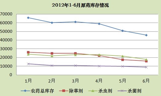 1-6月總庫存量為343401.813噸,除草劑和殺蟲劑庫存各月基本持平。6月總庫存46002.354噸,其中除草劑為15932.793噸,殺蟲劑為為17745.036噸,其他原藥如衛生殺蟲劑、生長調節劑等庫存為15969.687噸。