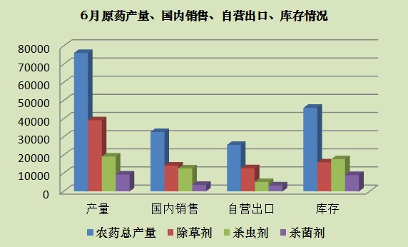 6月份農藥總產量較5月下滑20.46%,同比略下降8.31%。國內銷售環比下降16.69%,同比下降11.42%。各數據出現不同程度小幅度下降。