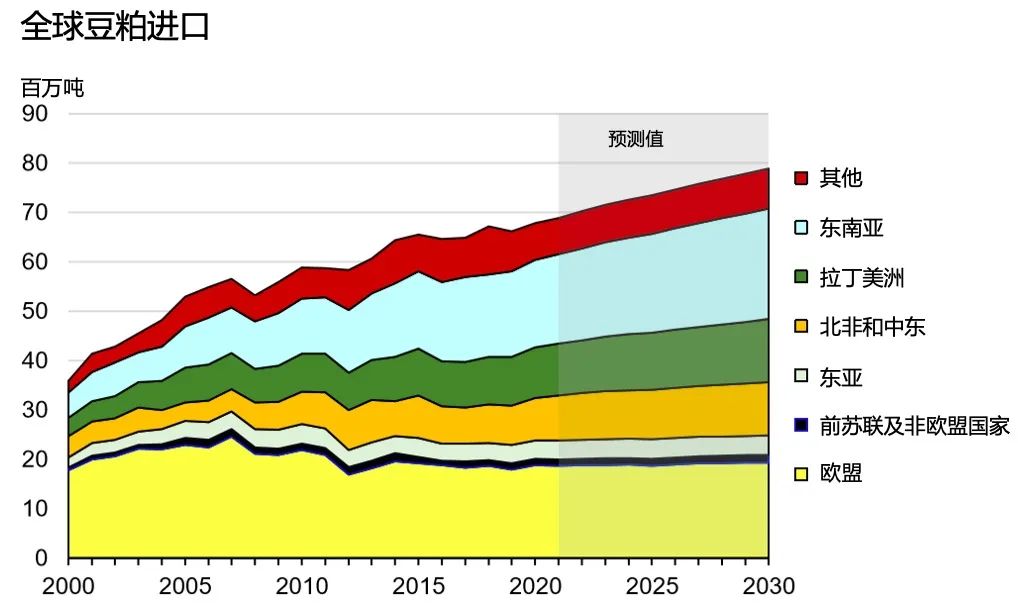展望期內,歐盟仍將是全球最大的豆粕進口市場。到2030/31年,歐盟的豆粕進口將增長3.7%,達到1,940萬噸;同時,東南亞、北非、中東和拉美地區的豆粕進口量也將有較大增幅,這是由于這些地區對牲畜飼料的需求不斷增長,且國內擴大油料種植的能力有限。其中,東南亞對全球豆粕進口增量的貢獻將高達43.1%--到2030/31年,印尼、菲律賓、泰國和馬來西亞的豆粕進口總量將增加270萬噸達1,530萬噸。