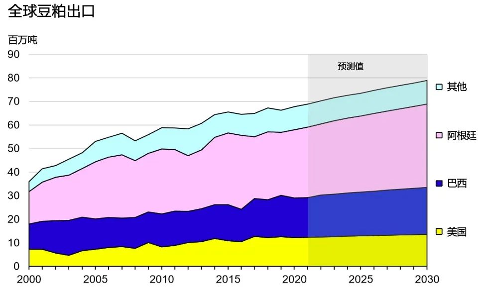 全球豆粕出口則將主要來自阿根廷、巴西和美國。到2030/31年,它們在全球豆粕出口中合計占比將高達87%,三國依次為45%、25%和17%。