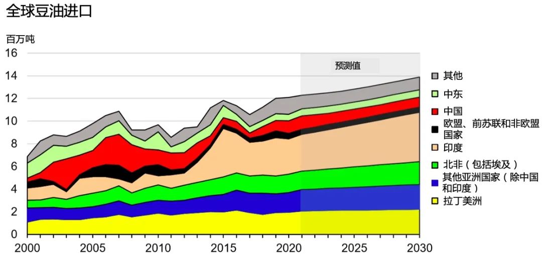印度是全球最大的豆油進口國。展望期內,其豆油進口量預計將增長34%,到2030/31年將增至440萬噸。推動印度豆油進口攀升的主要因素包括對食用油需求的迅猛增長,及其國內油籽種植面積的擴大潛力有限。