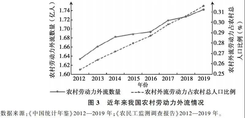 受到利益驅動,我國農村勞動力資源大量輸入第二、第三產業,并與糧食穩定增產保持一致性趨勢。合理的勞動力流動能夠促使不同產業部門相互協調,有助于提高人均勞動生產率,并分散糧食生產經營所面臨的各種風險。由于農業機械化與勞動力之間的要素替代關系,在不適合發展農業機械化的丘陵山區、城市郊區,農村勞動力轉移對糧食生產的改善作用會被削弱。另一個典型事實是,近年來農村勞動力外流數量以及其占農村總人口比例持續增加(圖3),已超過勞動力轉移的“劉易斯拐點”。加之農村人口老齡化的加劇,“未來誰來種地”問題成為社會各界人士的擔憂。一方面,青壯年勞動力轉移使得部分地區出現了不同程度的耕地撂荒現象,或者引起復種指數的人為下降,不利于糧食數量安全;另一方面,留在農村的“三八、六一、九九部隊”,由于時間分配、體能水平等約束,通常在糧食綠色生產技術采納方面劣勢明顯,不利于糧食質量安全、產地生態安全。