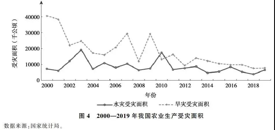 從現實來看,我國是全球氣候變化的敏感區和影響顯著區,氣候變化已成為威脅我國糧食產量及穩定性的主要作用因子。1951-2019年間,我國平均氣溫每10年便升高約0.24 ℃,升溫速率高于同期世界平均水平,極端高溫事件也顯著增加;年累計暴雨日數亦平均每10年增加約3.8%,極端強降水事件也呈增多趨勢,而平均年降水日數趨于減少??梢灶A見,隨著全球變暖持續加劇,我國農業仍將面臨水災、旱災等氣候災害帶來的不利影響(圖4)。更有研究預測,到21世紀末,氣候變化可能使中國水稻、小麥和玉米的產量分別下降36.25%、18.26%和45.10%。