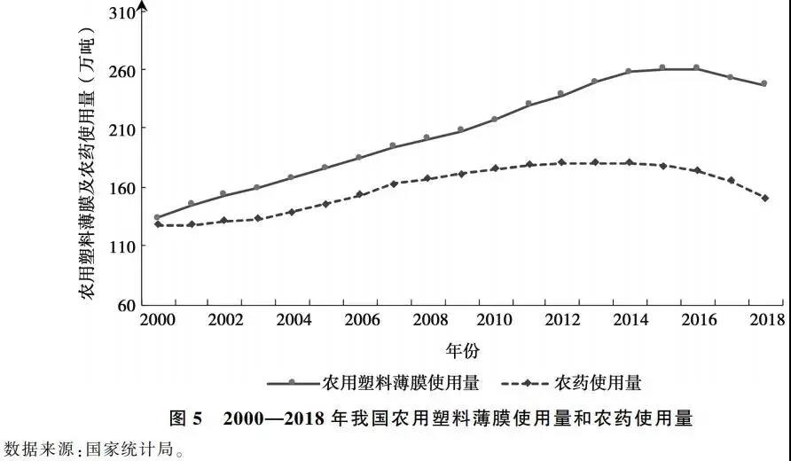 農業面源污染主要源于農用化學品過量施用、農業廢棄物的不合理處置等,防控和治理難度較大。就農用化學品投入而言,2015年我國農膜使用量260多萬噸,而回收利用率不足三分之二,2018年使用量略有下降,但仍然高達247萬噸(圖5)。農藥殘留會流入河塘、溝渠,污染水體,使農產品有毒物質超標;化肥的過量施用使得總磷、總氮等大量污染物進入水體及耕地土壤,污染地下水和耕地并對糧食質量安全、產地生態安全造成影響。盡管我國2015年實施的化肥農藥使用量零增長行動目標已于2020年底順利實現,但從總量上來看,農藥使用量、農用化肥施用折純量仍然不容樂觀(圖5、圖6)。就農業有機廢棄物而言,農作物秸稈、畜禽糞尿的不合理處置不僅對地表水、地下水造成污染,其大量堆積還會使得農田過肥,對其造成腐蝕,進而使農田質量降低乃至失去生產能力。據估計,僅2014年中國農作物秸稈資源量約為9.89億噸,畜禽糞尿資源量(鮮重)更是高達26.81億噸,而其中不少并未得到合理利用。