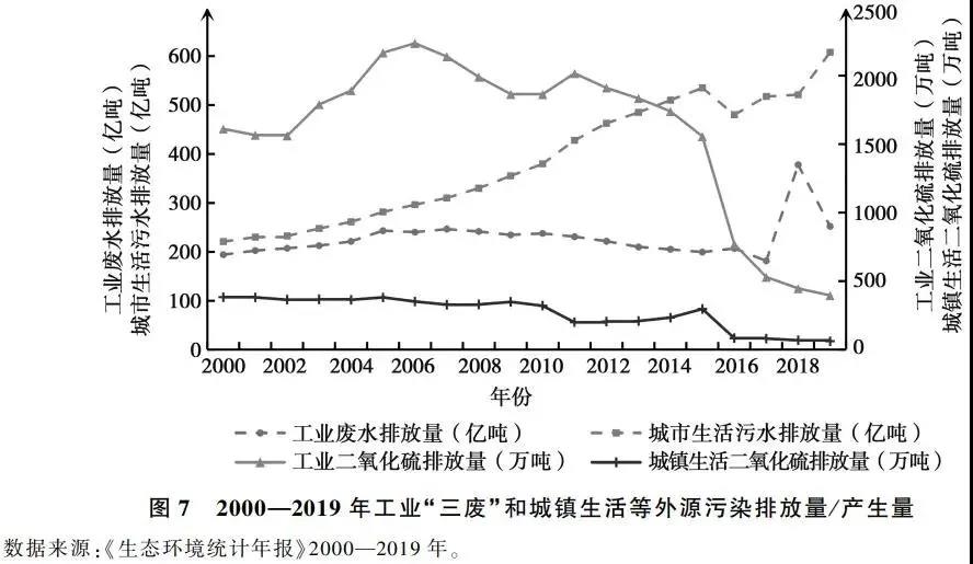 糧食安全所面臨的環境約束與工業化、城鎮化過程中引發的外源性污染不無關系。由于農村地區生產要素價格較為低廉、環境規制較為寬松,大量工業企業將農村視為“污染避難所”,向城郊、農村地界進駐。大量工業外源性污染由城市向農村轉移,加之城鎮生活污水的過量排放(圖7),其結果必然帶來土壤污染加劇,進而導致土地正常功能受限、土質下降。據環境保護部、國土資源部于2014年發布的《全國土壤污染狀況調查公報》顯示,全國受污染耕地約占全部采樣耕地的19.4%,其中重金屬污染是元兇之一。更為嚴重的是,土壤污染物在糧食作物中蓄積,通過食物鏈逐級富集到人體,進而對人體健康造成威脅。例如,近年來“鎘大米”“毒蔬菜”等事件屢屢發生,也引發了國民對糧食質量安全的擔憂。