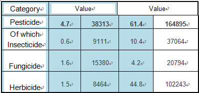 During Jan.-May 2016, the pesticide export total volume reached 614,000 tons, an increase of4.9% YoY, and the export value reached 1.649billion US dollars, a decrease of 7.2%. Whilethe insecticide export volume was 104,000 tons, up 9.9% YoY, export value was 371 million US dollars, down 2.6%; the fungicide export volume was 42,000 tons, up 20.0% YoY, export value was 208 million US dollars, up 6.5%; the herbicide export volume was448,000 tons, up3.0% YoY, export value was 1,02billion US dollars; drop 11.3% YoY.
