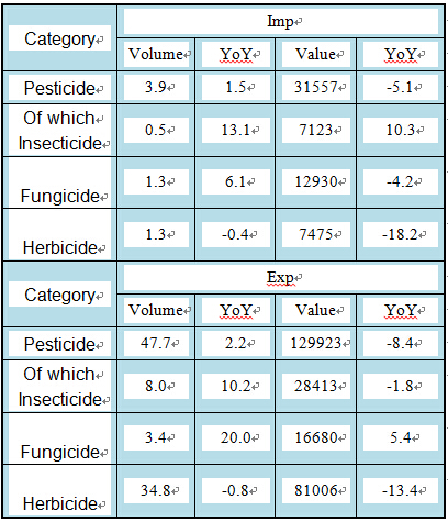 Category total import & export volume Trade Balance From Jan.to April 2016 From Jan.to April 2015 YoY From Jan.to April 2016 From Jan.to April 2015 YoY Pesticide 161480 175067 -7.8 98366 108533 -9.4 Of which Insecticide 35536 35377 0.4 21290 22461 -5.2 Fungicide 29610 29325 1.0 3751 2323 61.5 88480 102657 -13.8 73531 84386 -12.9