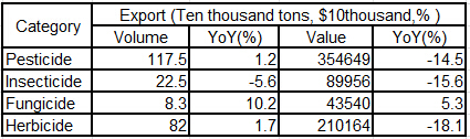 In 2015, the pesticide export total volume reached 1,175,000 tons, an increase of 1.2%, and the export value reached 35.46 billion US dollars, a sharp decrease of 14.5%. While the fungicide export volume and value keep growth, respectively up by 10.2% and 5.3%. Although both the export volume and price dropped, the proportion of pesticide formulations exports out of the total pesticide export keeps growing and has become the main export force, while the proportion of pesticide TC exports kept dropping year by year.