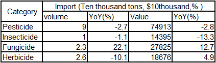Over the same period, the pesticide import total volume reached a total of 90,000 tons, while imports amounted to 0.749 billion US dollars, respectively down by2.7% and 2.8%.