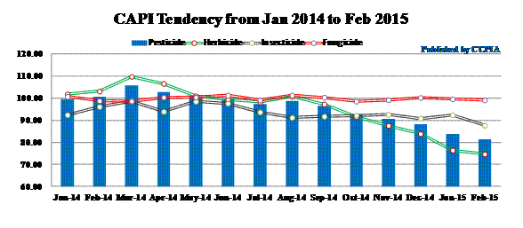 With the arrival of 2015, the pesticide industry will face a year with more challenges and reforms. The official implementation of the new environmental protection law is of great significance to regulate the industry and promote transformation. According to the statistics of CCPIA, since the beginning of 2015, a number of small and medium-sized pesticide enterprises have been shut down for maintenance and 2015 is expected to be a key year for extensive adjustment in the pesticide industry. This January the CAPI started at the lowest value - 83.95, down 4.72% from that of the last statistical period and a steep fall of 15.63% year on year; in February with the commencement of the industry and the market operation being affected by Chinese New Year, the overall market saw falling prices. The CAPI continued to fall and hit 81.28, down 3.18% from January and a significant fall of 19.31% year on year. This is the “omen” of industry reform and transformation. After the continuous fall in price, the industry will gradually welcome new busy seasons of production and sales. The CAPI is expected to up in March and it is ready to rebound from the bottom.