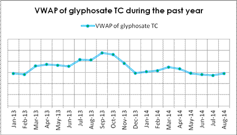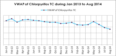 According to CCPIA Monthly Bulletin of Statistics of China Pesticides, in Aug, VWAP ofchlorpyrifos TC fell by $233.3 per tonne. Although it’s the third month that price of chlorpyrifos TC going down, it seems that the tendency won’t keep that long. Overall, price of chlorpyrifos TC kept going smoothly during 2014.
