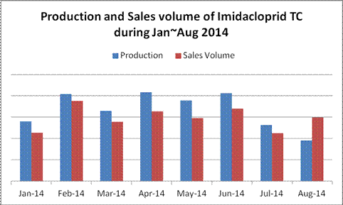 According to CCPIA Monthly Bulletin of Statistics of China Pesticides, in Aug, VWAP of imidacloprid TC declined by $1180 per tonne than that of Jul. Actually seen from the recent one year’s tendency, price of imidacloprid has been generally going down, especially in 2014. Most manufacturers’ transaction price didn’t change in Aug, while some declined over 8% MoM.