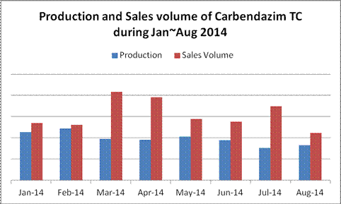 According to CCPIA Monthly Bulletin of Statistics of China Pesticides, in Aug, VWAP ofcarbendazim TC declined by 3.6% than that of Jul. Seen from the transaction price tendency, it has been declining for four months in a row till Aug. Actually market of carbendazim TC didn’t perform well during the same period last year, mostly because the overseas demand couldn’t fulfill the output.