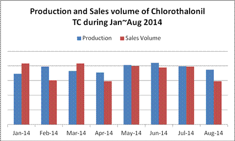 With one less manufacturer operating in Aug (compared with that of Jul), output of chlorothalnil TC declined slightly by 5.7% and sales volume dipped by 25% MoM. According to the manufacturers, sales volume’s declining was mainly caused by the dipped exports compared with that of Jul.