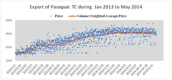 Seen from the paraquat market, in Mar, VWAP of paraquat TK(100% basis) reached $15650 per tonne in China, increased by 20.05% than that of the beginning of 2014. However the price began to fell afterwards, till the end of May, VWAP of paraquat TK (100% basis) declined to $14100 per tonne.