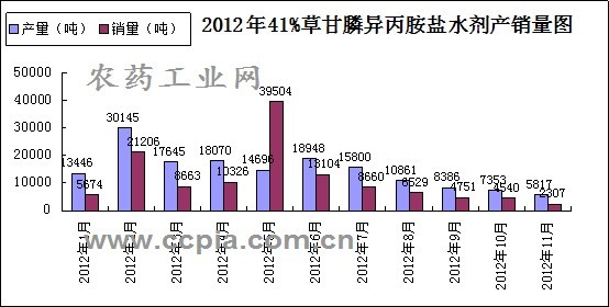 以下為41%草甘膦異丙胺鹽水劑2012年1-11月產量和銷量趨勢圖: