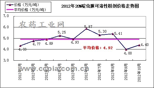 據(jù)農藥工業(yè)網數(shù)據(jù)統(tǒng)計,20%啶蟲脒可溶性粉劑2012年10月價格為4.40萬元/噸,較9月環(huán)比上漲10.0%,較去年10月同比上漲9.2%。從今年的價格走勢來看,價格最高點為今年6月,價格為5.87萬元/噸,最低點為9月,價格為4.00萬元/噸,價格下降明顯。