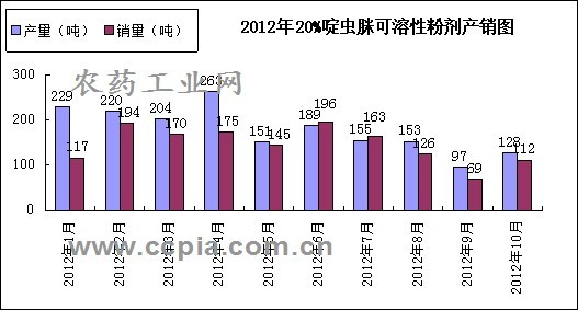 以下為20%啶蟲脒可溶性粉劑2012年1-10月產量和銷量趨勢圖: