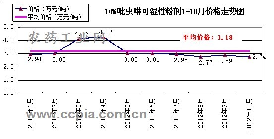 據農藥工業網數據統計,10%吡蟲啉可濕性粉劑2012年10月價格為2.74萬元/噸,環比下降5.2%,同比下降7.1%。從2012年的價格走勢來看,價格最高點為4月,價格為4.27萬元/噸,最低點為10月,價格為2.74萬元/噸。2012年1-10月10%吡蟲啉可濕性粉劑平均價格為3.18萬元/噸。從4月以來,10%吡蟲啉可濕性粉劑價格一路下行,目前為今年來的最低點。