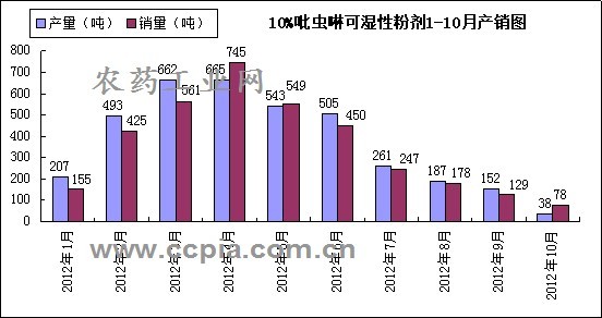 2012年10月份10%吡蟲啉可濕性粉劑產量為38噸,環比下降75.0%,同比下降75.6%;銷量為78噸,環比下降39.5%,同比下降54.9%。從趨勢圖上來看,10%吡蟲啉可濕性粉劑產銷量一直比較均衡,產銷主要集中在2月到6月。6月之后,產銷量下降明顯,10月份為今年產銷最低點。