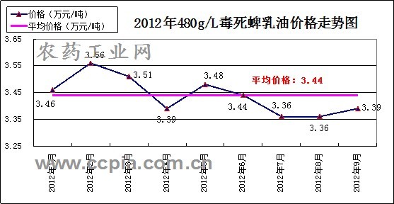據(jù)農(nóng)藥工業(yè)網(wǎng)數(shù)據(jù)統(tǒng)計(jì),480克/升毒死蜱乳油2012年9月價(jià)格為3.36萬元/噸,較8月環(huán)比上漲0.9%,較去年同期同比上漲6.3%。從今年的價(jià)格走勢(shì)來看,價(jià)格最高點(diǎn)為今年2月,價(jià)格為3.56萬元/噸,最低點(diǎn)為今年7月,價(jià)格為3.36萬元/噸。
