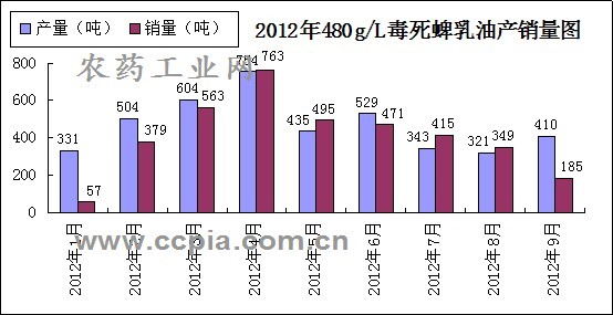 以下為480克/升毒死蜱乳油2012年1-9月產(chǎn)量和銷量趨勢(shì)圖: