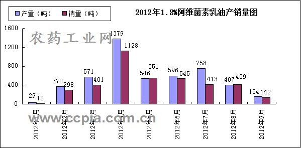 以下為1.8%阿維菌素乳油2012年1-9月產量和銷量趨勢圖: