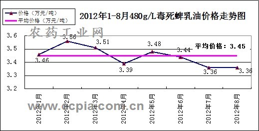 480g/L毒死蜱乳油2012年8月價格為3.36萬元/噸,與7月持平,較去年同期同比上漲7.0%。從今年的價格走勢來看,價格最高點為今年2月,價格為3.56萬元/噸,最低點為今年7月和8月,價格為3.36萬元/噸。