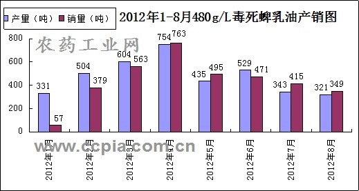 今年8月份480g/L毒死蜱乳油產量為321噸,較7月環比下降17.4%,較去年8月同比下降28%;銷量為349噸,產銷比較均衡,銷量環比上漲19.3%,同比上漲52.7%。由此可見,480g/L毒死蜱乳油8月份產量環比和同比都大大下降,而銷量正好相反,環比和同比都大大增加。