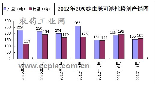 今年7月份20%啶蟲脒可溶性粉劑產(chǎn)量為155噸,較6月環(huán)比下降18.0%,較去年7月同比增加49%;銷量為163噸,環(huán)比下降16.8%,同比增加79.1%。由此可見,20%啶蟲脒可溶性粉劑7月份產(chǎn)銷量與上月相比有一定下降,而與去年同期相比則產(chǎn)銷量都大增。