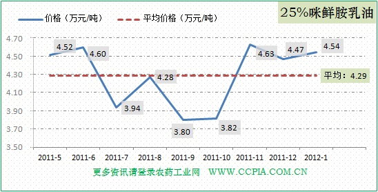 25%咪鮮胺乳油1月份均價:4.54萬元/噸,各企業之間報價差別大,造成該產品價格波動較大,近半年來的平均價格為4.29萬元/噸,具體價格走勢如圖。