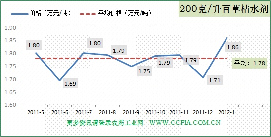 200克/升百草枯水劑近半年來價格比較平穩,均價在1.78萬元/噸。1月份價格上漲至1.86萬元/噸,隨著節后企業逐步開工,預計后期會回落到均價水平。