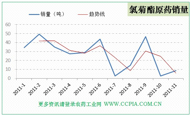【農藥工業網】氯菊酯原藥主要生產企業2011年11月份銷售8.63噸(折百量),2011年10月份銷售為2.80噸(折百量)。2011年1-10月份累計銷售294.08噸(折百量)。