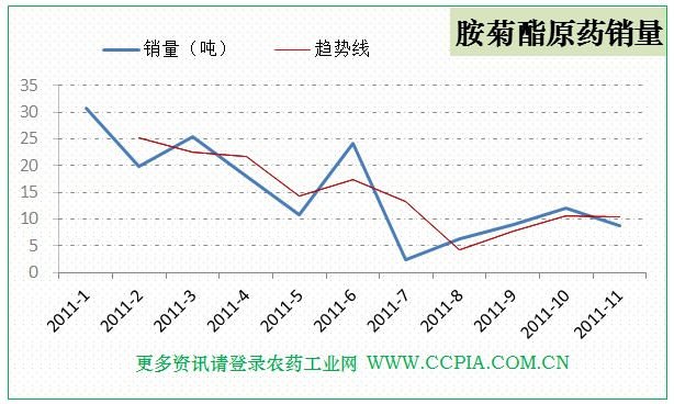 【農藥工業網】胺菊酯原藥2011年11月份銷售為8.79噸(折百量),2011年10月份銷售為12.04噸(折百量),環比減少27.00%。2011年1-11月份累計銷售167.21噸(折百量)。